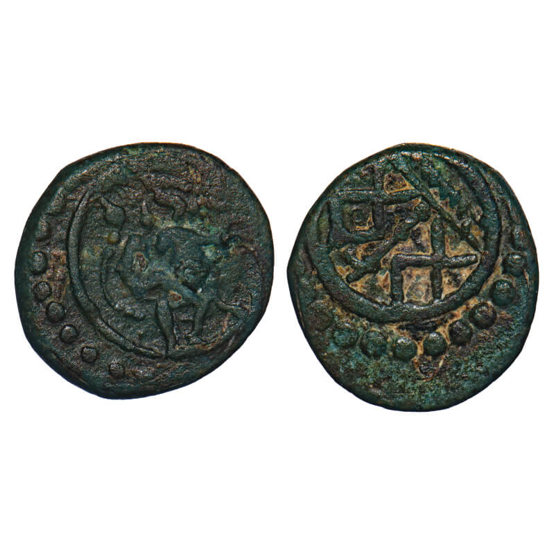 Travancore, Copper Thirai Cash, 1.29g, Obv: Vyagrapada to right, Rev: Ankus between 2 "fish" symbols. "Ladder" or beads beneath. Very Fine, Very Scarce.