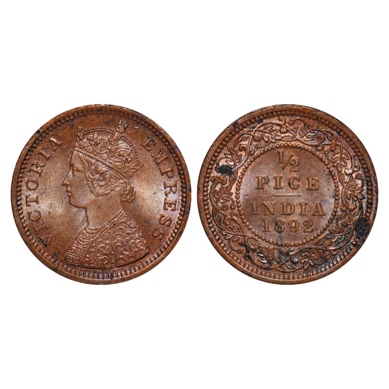Victoria Empress, Copper, 1/2 Pice, 1892, Calcutta Mint, A/I, No mint mark. F. Prid 725. GK 872. Uncirculated. Rare.