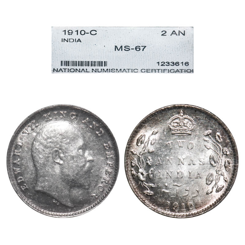 Edward VII, Silver, 2 Annas, 1910, Calcutta Mint, No mint mark. F. Prid 563. GK 987. NGC Slab MS 65...