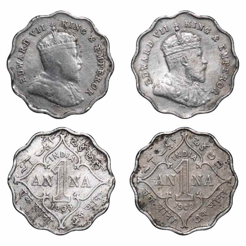 | Edward VII, Copper-Nickel, 1 Anna, (2 coins), 1908, 1909, Bombay Mint, 'B' incused. F. Prid 927, 928. GK 991, 992. Fine to Very Fine. Scarce. |