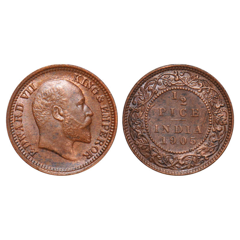 Edward VII, Copper, Half Pice, 1905, Calcutta Mint, No mint mark, Complete skull ghost on Rev. F. Prid 738. GK 1005. Uncirculated. Very scarce.