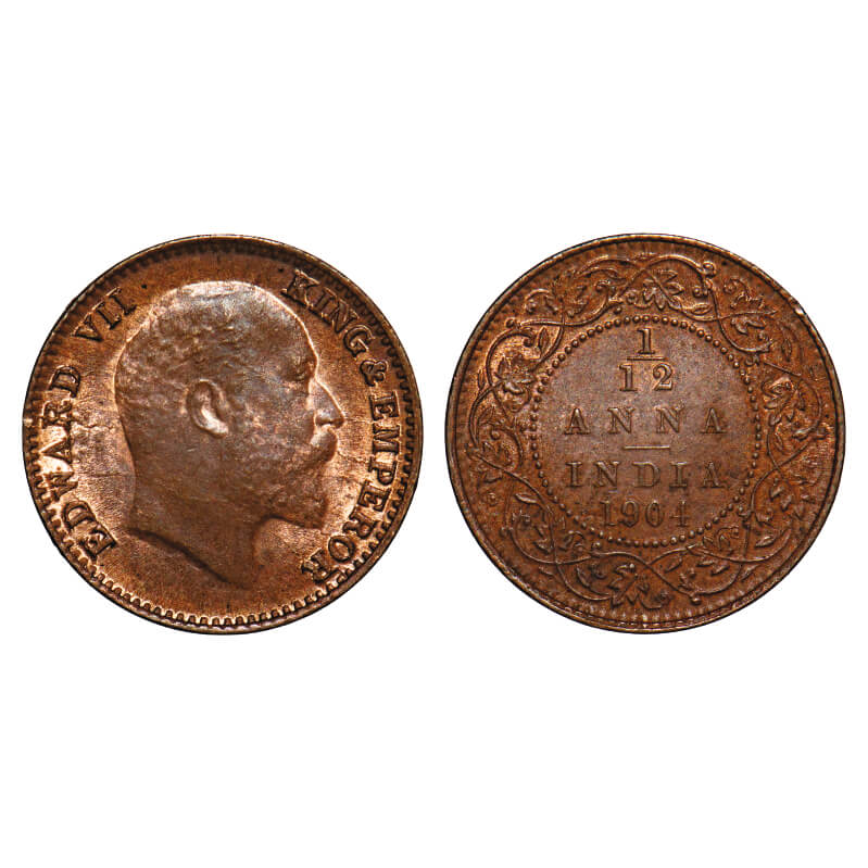Edward VII, Copper, 1/12 Anna, 1904, Calcuutta Mint, No mint mark, Multiple die cracks on Obv. F. Prid 819. GK 1013. About Uncirculated. Very Scarce.