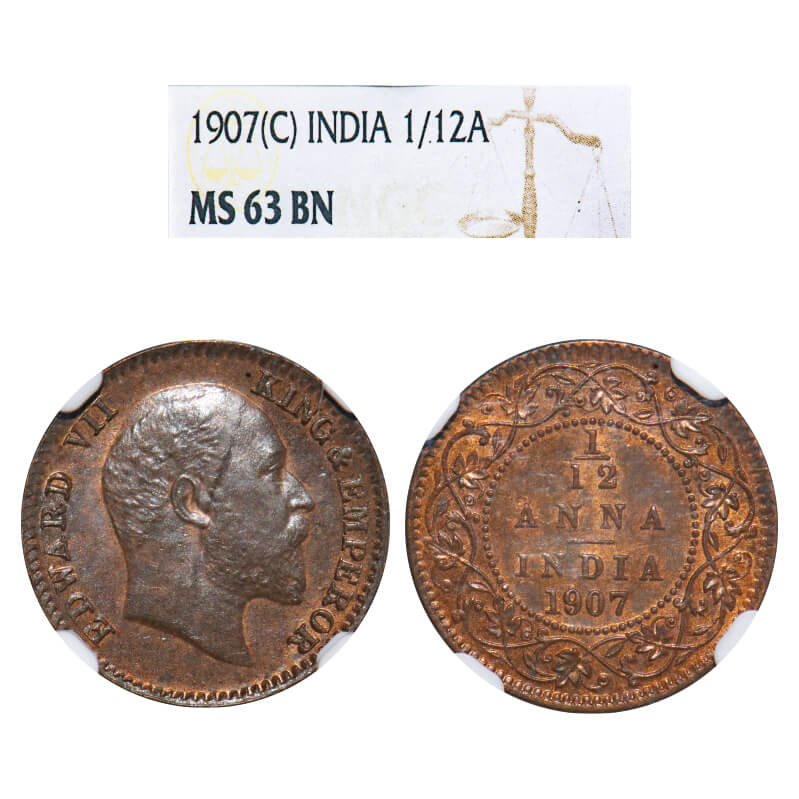 Edward VII, Bronze, 1/12 Anna, 1907, Calcutta Mint, No mint mark. F. Prid 823. GK 1017. NGC Slab MS 63 BN. Rare.