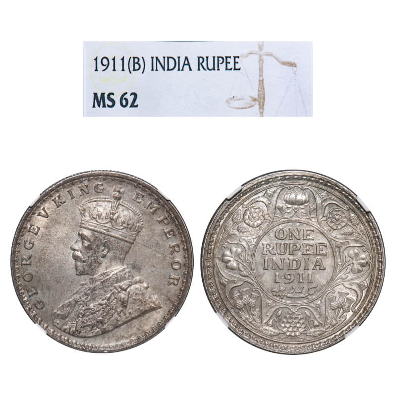 George V, Silver, Rupee, 1911, Bombay Mint, Dot, Pig-Type. F. Prid 217. GK 1022. NGC Slab MS 62. Very Rare.
