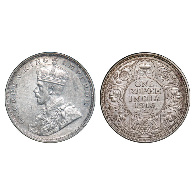 George V, Silver, Rupee, 1916, Calcutta Mint, No dot. F. Prid 212. GK 1033. Uncirculated. Scarce.
