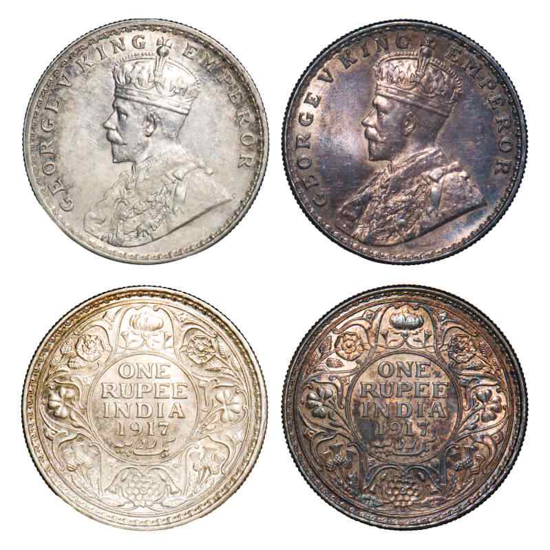 | George V, Silver, Rupee, 1917, (2 coins), 1) Calcutta Mint, No dot, 2) Bombay Mint, Dot. F. Prid 213, 223. GK 1035, 1036. Uncirculated to Almost Uncirculated. Very Scarce. |