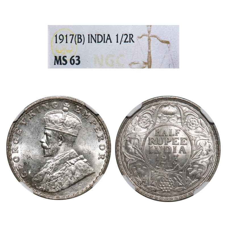 George V, Silver, Half Rupee, 1917, Bombay Mint, Dot. F. Prid 341. GK 1055. NGC Slab MS 63. Rare.