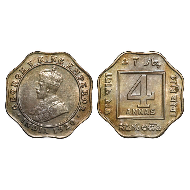 George V, Copper-Nickel, 4 Annas, 1920, Calcutta Mint, No dot. F. Prid 875. GK 1103. About Uncirculated. Very Scarce.