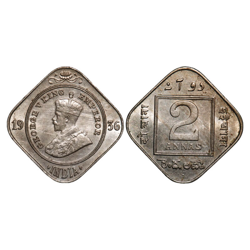 George V, Copper-Nickel, 2 Annas, 1936, Bombay Mint, Dot. F. Prid 903. GK 1140. Almost Uncirculated. Scarce.