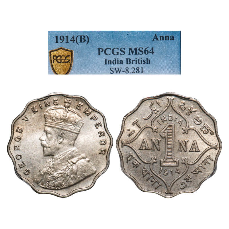 George V, Copper-Nickel, 1 Anna, 1914, Bombay Mint, No dot. F. Prid 944. GK 1144. PCGS Slab MS 64. Very Rare.