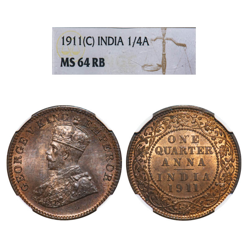 George V, Bronze, Quarter Anna, 1911, Calcutta Mint, No dot, Pig-Type. F. Prid 656. GK 1171. NGC Slab MS 64 RB. Exceedingly Rare. (In NGC 6 coins are graded higher then MS 64 RB and in PCGS 3 coin are graded higher then MS 64 RB, Till date)
