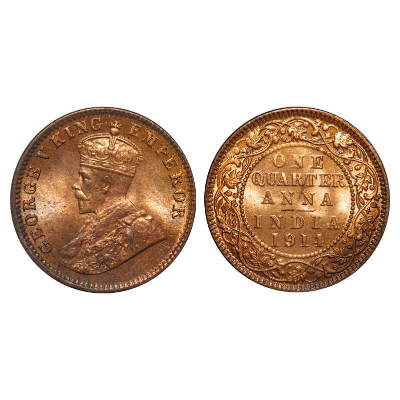George V, Bronze, Quarter Anna, 1914, Calcutta Mint, No dot. F. Prid 660. GK 1174. Brilliant Uncirculated. Very Scarce.