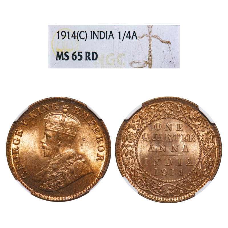 George V, Bronze, Quarter Anna, 1914, Calcutta Mint, No dot. F. Prid 660. GK 1174. NGC Slab MS 65 RD. Extremely Rare. (In NGC only 1 coins are graded higher then MS 65 RD and in PCGS non are graded higher, Till date)