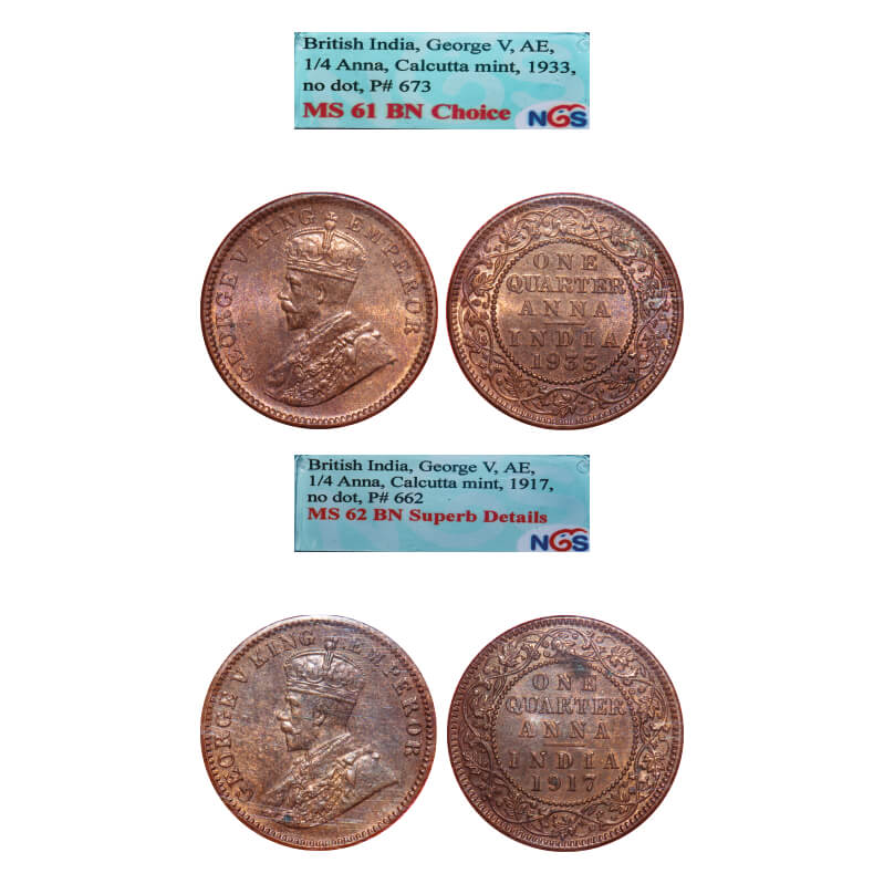 | George V, Bronze, Quarter Anna, (2 slabs), 1917, 1933, Calcutta Mint, No dot. F. Prid 662, 673. GK 1176, 1193. NGS Slab MS 62 BN Superb, MS 61 BN Choice. Very Scarce. |