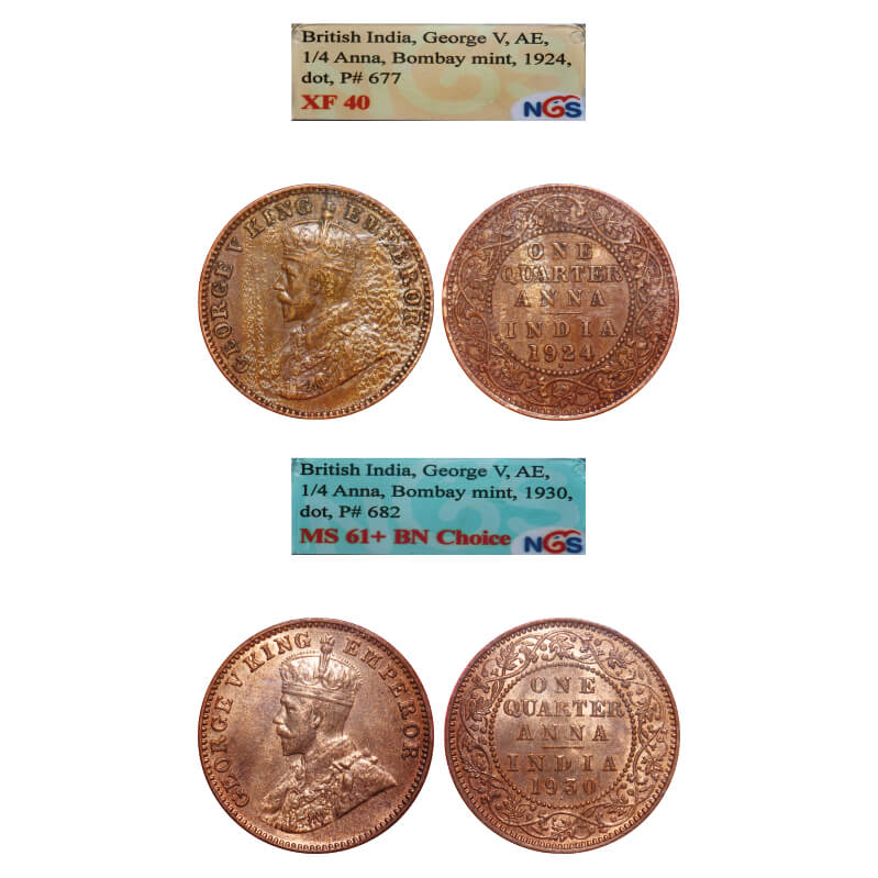 | George V, Bronze, Quarter Anna, (2 slabs), Bombay Mint, Dot, 1) 1924, 2) 1930, With more space in between the date numerals. F. Prid 677. GK 1180, Unlisted. NGS Slab XF 40, MS 61+ BN Choice. Very Scarce. |