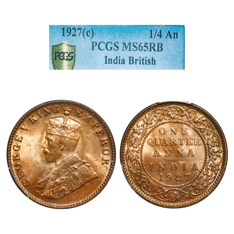 George V, Bronze, Quarter Anna, 1927, Calcutta Mint, No dot. F. Prid 668. GK 1186. PCGS Slab MS 65 RB. Very Rare.
