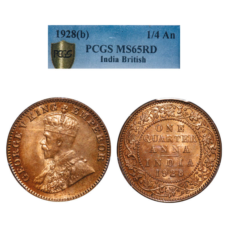George V, Bronze, Quarter Anna, 1928, Bombay Mint, Dot. F. Prid 681. GK 1187. PCGS Slab MS 65 RD. Very Rare.