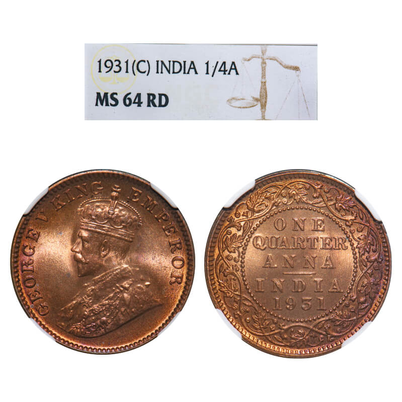 George V, Bronze, Quarter Anna, 1931, Calcutta Mint, No dot. F. Prid 672. GK 1192. NGC Slab MS 64 RD. Extremely Rare.