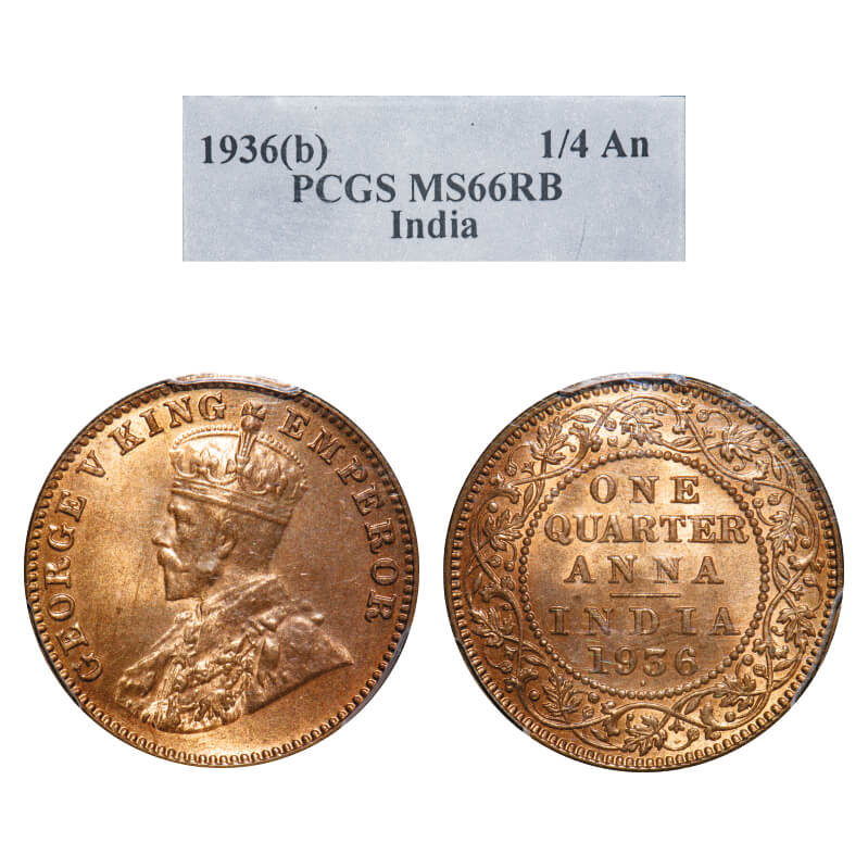 George V, Bronze, Quarter Anna, 1936, Bombay Mint, Dot. F. Prid 683. GK 1196. PCGS Slab MS 66 RB. Extremely Rare.