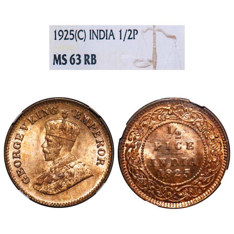 George V, Bronze, 1/2 Pice, 1925, Calcutta Mint, No mint mark. F. Prid 758. GK 1211. NGC Slab MS 63 RB. Very Rare.