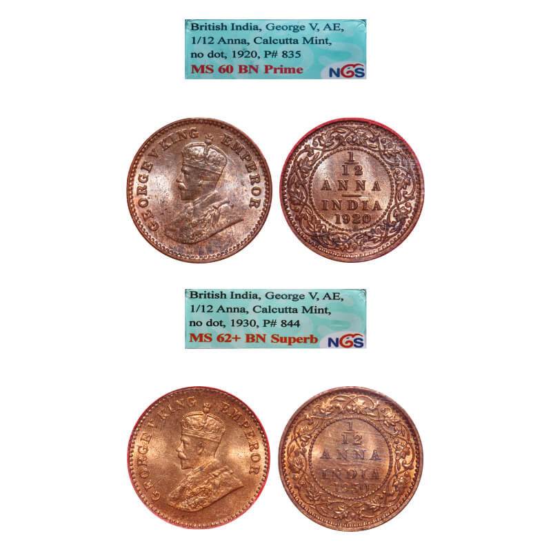 | George V, Bronze, 1/12 Anna, (2 slabs), 1920, 1930, Calcutta Mint, No mint mark. F. Prid 835, 844. GK 1231, 1246. NGS Slab MS 60 BN Prime, MS 62+ BN Supeb. Very Scarce. |
