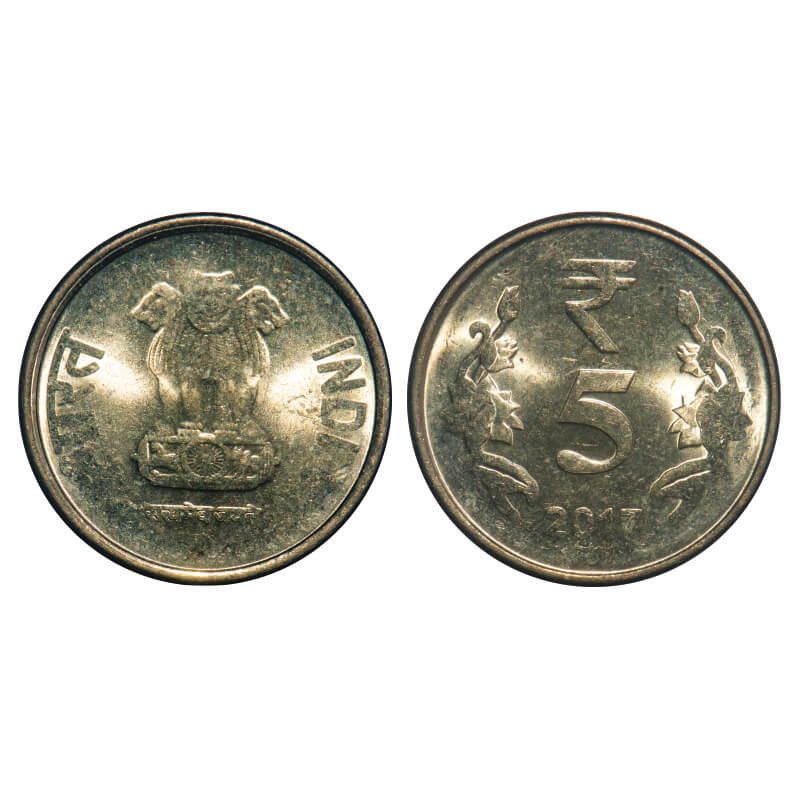 5 Rupees, 2017, Brass, on obv Lion is of 1 Rupee die, Mule, Almost Uncirculated. Scarce.