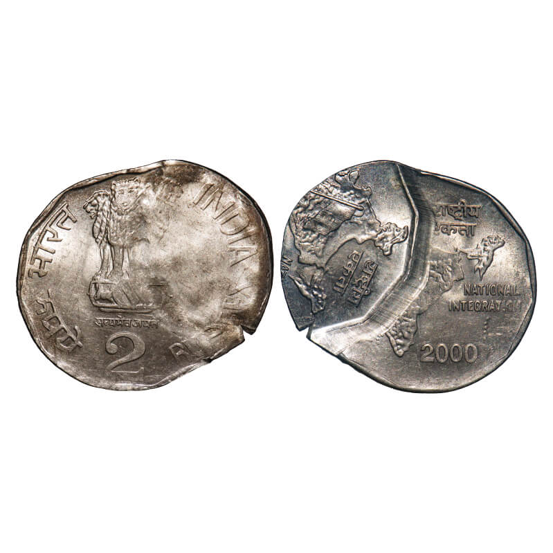 2 Rupees, 2000, Copper Nickel, Obv: Ashoka Pedestal – Type A, Rev: Partial Brockage (around 25%) of...