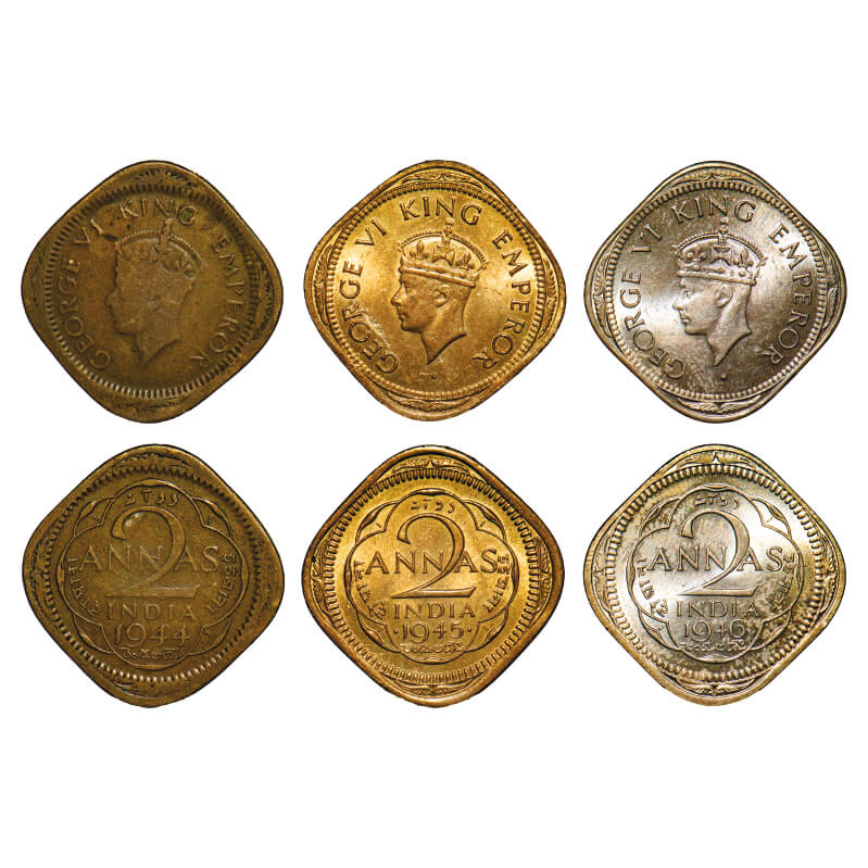 | George VI, Mix metal, 2 Annas, (3 coins), 1) Nickel-Brass, 1944, Lahore Mint, No dots by year, Head Type II, 'L' raised four times in the quatrefoil angles / Large numeral 44, 2) Nickel-Brass, 1945, Bombay MInt, dots by year, Head Type II, Tip of Crown not touching 'N' in King, 3) Nickel-Brass, 1946, Calcutta Mint, No dots by year, Head Type II, Large numeral 6, 2nd 'N' in Annas does not touch the down swing of numeral 2. F. Prid 908, 921, 912. GK 1366, 1368, 1372. Very Fine+ to Brilliant Uncirculated. Scarce. |