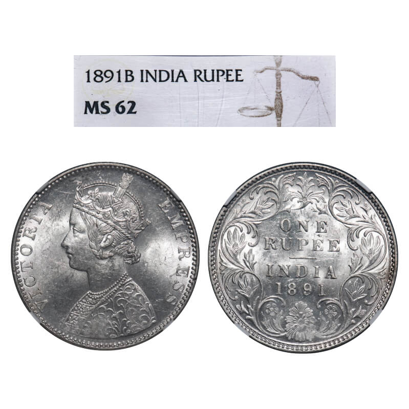 Victoria Empress, Silver, Rupee, 1891, Bombay Mint, C2/I, 'B' incused. F. Prid 179. GK 569. NGC Slabbed MS 62. Very Rare.