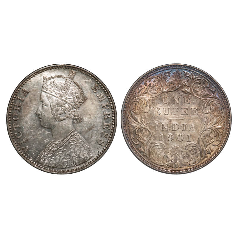 | Victoria Empress, Silver, Rupee, 1901, Bombay Mint, A3(i)/I(ii), 'B' incused, Flat 1. F. Prid Unlisted. GK 591. Brilliant Uncirculated, Partly Toned Rev. Very Scarce. |