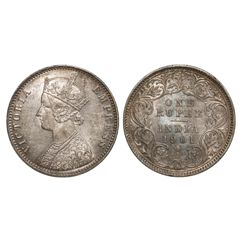 | Victoria Empress, Silver, Rupee, 1901, Calcutta Mint, C3/I(i), 'C' incused, Flat 1, Die crack on Obv. F. Prid 139. GK 598. Uncirculated, Rev Toned. Rare. |