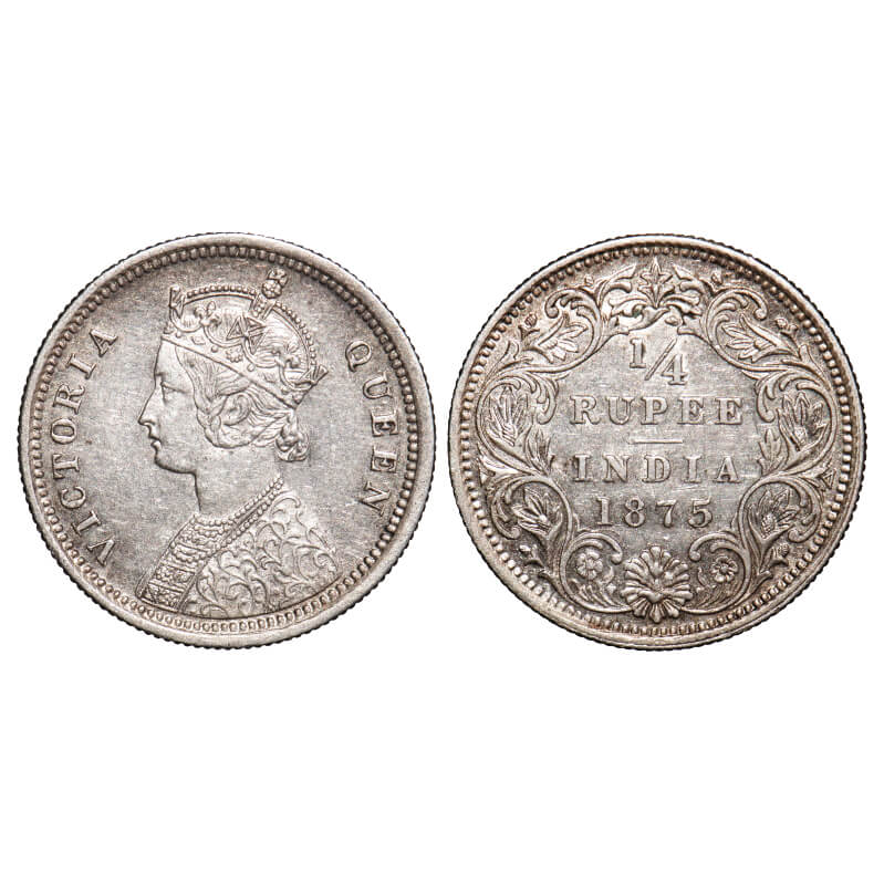 Victoria Queen, Silver, 1/4 Rupee, 1875, Bombay Mint, A/I, No dot. F. Prid 406. GK 666. About Uncirculated. Rare.