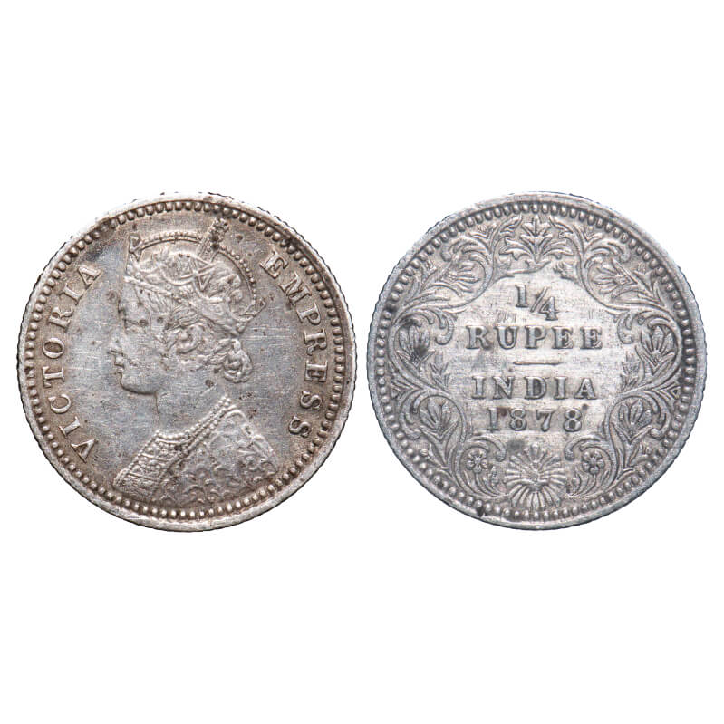 Victoria Empress, Silver, 1/4 Rupee, 1878, Calcutta Mint, C/II, No mint mark, No 'C'. F. Prid 383. GK 673. Very Fine. Very Scarce.