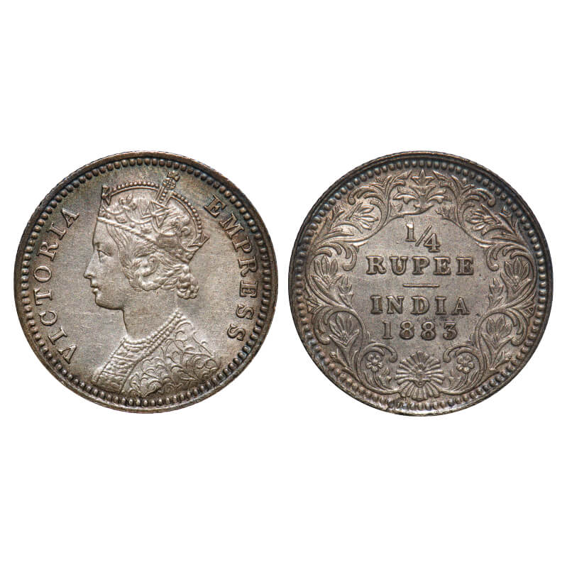 Victoria Empress, Silver, 1/4 Rupee, 1883, Calcutta Mint, C/II, 'C' incused. F. Prid 388. GK 692. About Uncirculated. Rare.