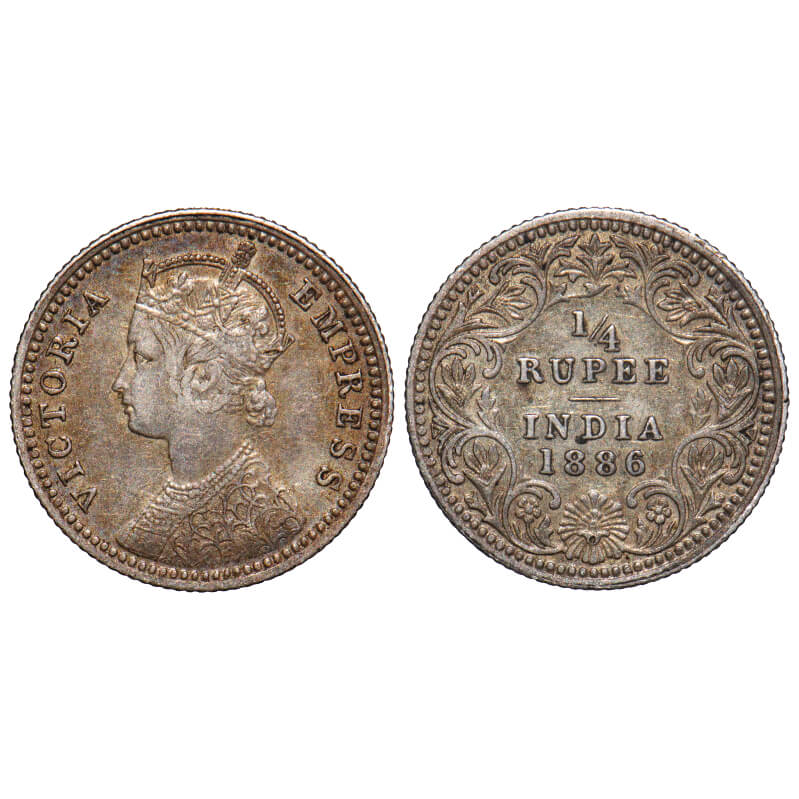 Victoria Empress, Silver, 1/4 Rupee, 1886, Calcutta Mint, C/II, 'C' incused. F. Prid 391. GK 707. Extremely Fine. Very Scarce.