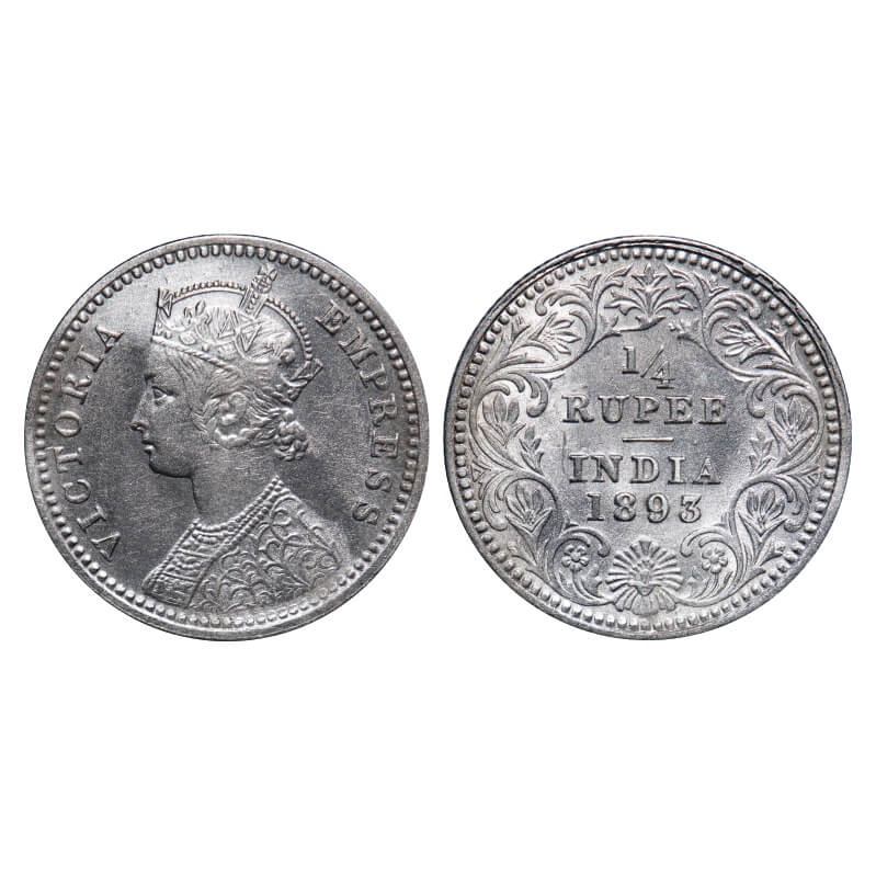 Victoria Empress, Silver, 1/4 Rupee, 1893, Calcutta Mint, C/II, 'C' incused. F. Prid 398. GK 725. Extremely Fine+. Very Scarce.