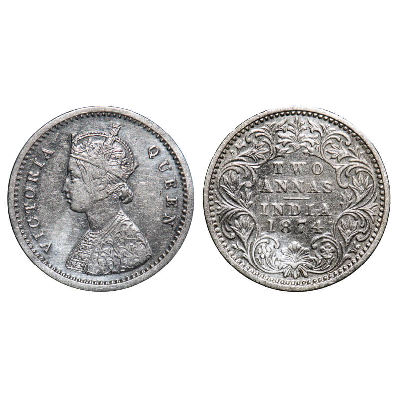 Victoria Queen, Silver, 2 Annas, 1874, Bombay Mint, A/I, No mint mark, No dot. F. Prid. Unlisted GK 738. Extremely Fine+. Very Scarce.