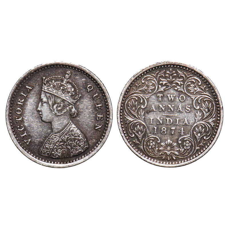Victoria Queen, Silver, 2 Annas 1874, Bombay Mint, A/I, No mint mark, No dot. F. Prid Unlisted. GK ...