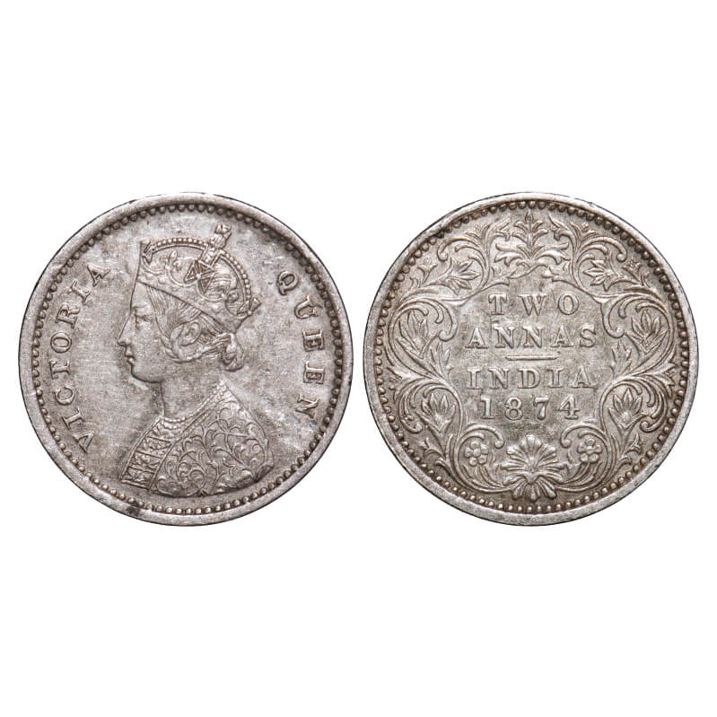 Victoria Queen, Silver, 2 Annas, 1874, Calcutta Mint, A/I, No mint mark. F. Prid 488. GK 740. Very ...