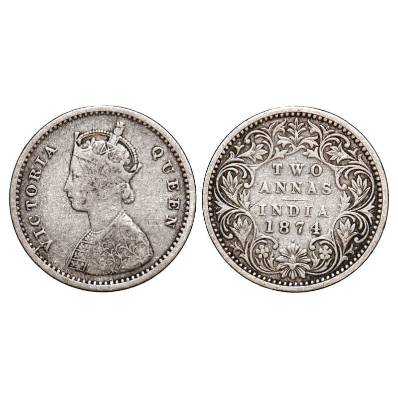 Victoria Queen, Silver, 2 Annas, 1874, Calcutta Mint, A/I, No mint mark. F. Prid 488. GK 740. Very ...
