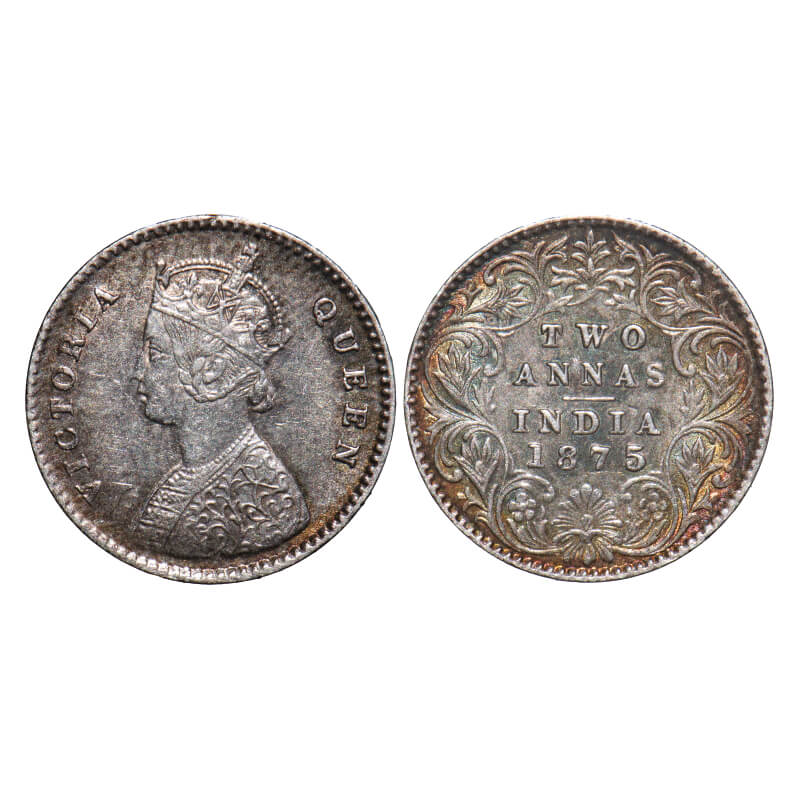 Victoria Queen, Silver, 2 Annas 1875, Calcutta Mint, A/I, No mint mark. F. Prid 489. GK 742. About Uncirculated. Very Scarce.