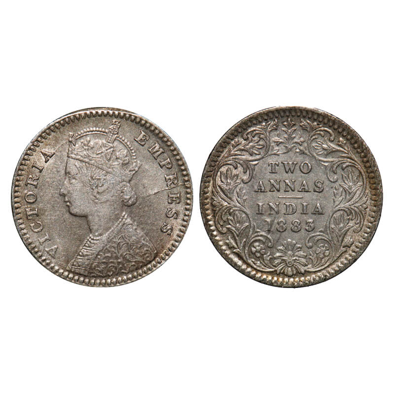 | Victoria Empress, Silver, 2 Annas, 1883, Calcutta Mint, B/II, 'C' incused, Ghost on Rev, Die crack on Obv. F. Prid 498. GK 768. Extremely Fine. Very Scarce. |