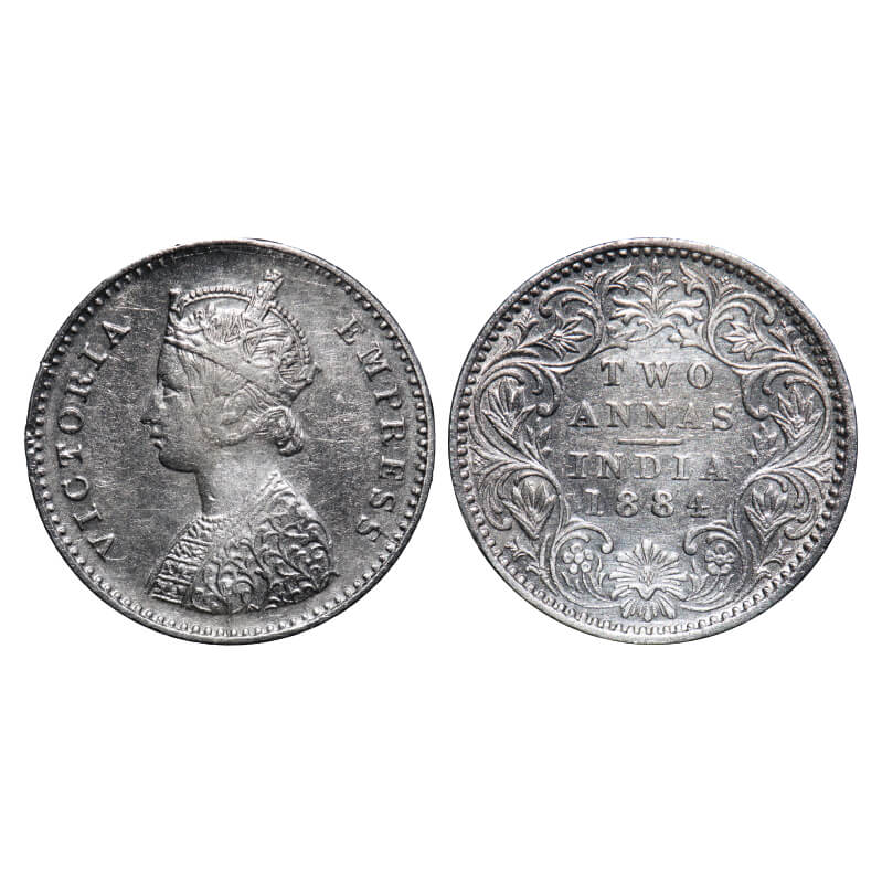 Victoria Empress, Silver, 2 Annas, 1884, Bombay Mint, A/I, No dot. F. Prid 531. GK 769. Extremely Fine+. Rare.