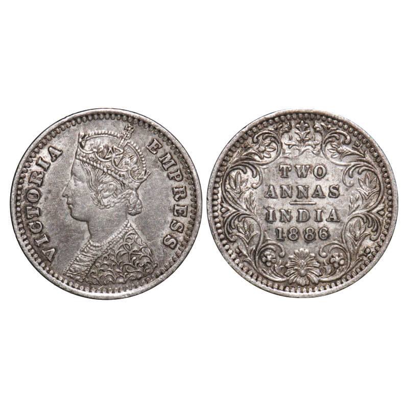Victoria Empress, Silver, 2 Annas 1886, Bombay Mint, B/II, 'B' incused, Note: Jumping numeral 6 in year date 1886. F. Prid 539. GK 781. Extremely Fine. Very Scarce.