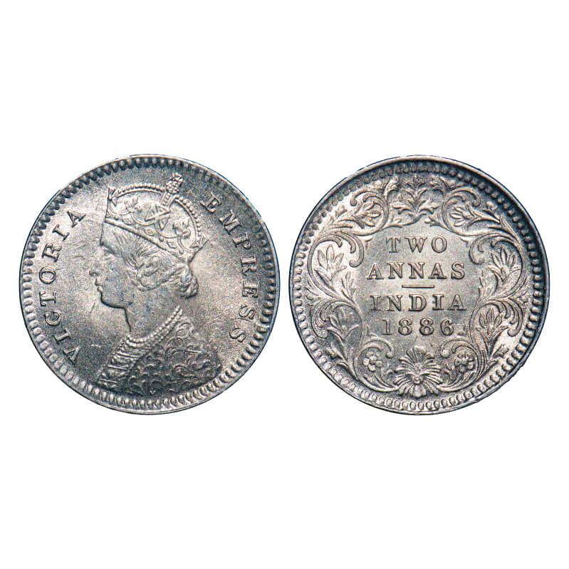 Victoria Empress, Silver, 2 Annas, 1886, Calcutta Mint, B/II, 'C' incused, Die cracks on Obv. F. Prid 501. GK 782. Uncirculated. Rare.
