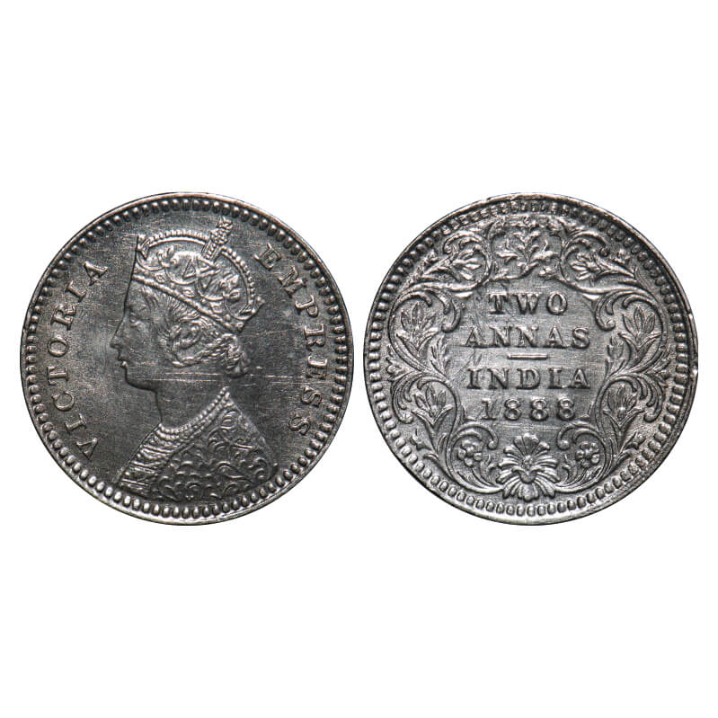 Victoria Empress, Silver, 2 Annas, 1888, Calcutta Mint, B/II, No mint mark, No 'C'. F. Prid 503. GK 786. Almost Uncirculated. Rare.