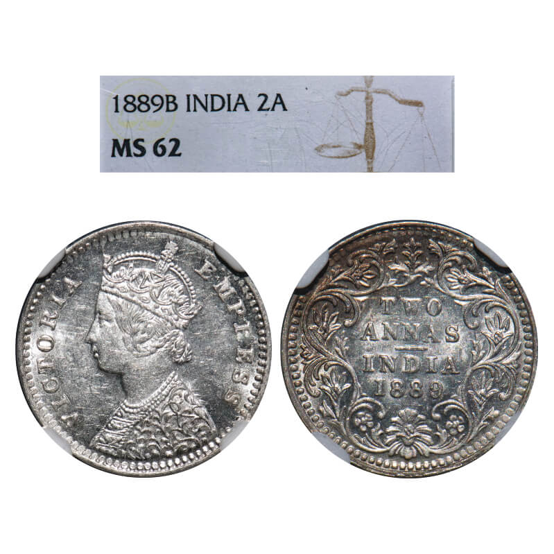 Victoria Empress, Silver, 2 Annas, 1889, Bombay Mint, B/II, 'B' incused. F. Prid 542. GK 787. NGC Slabbed MS 62. Very Rare.