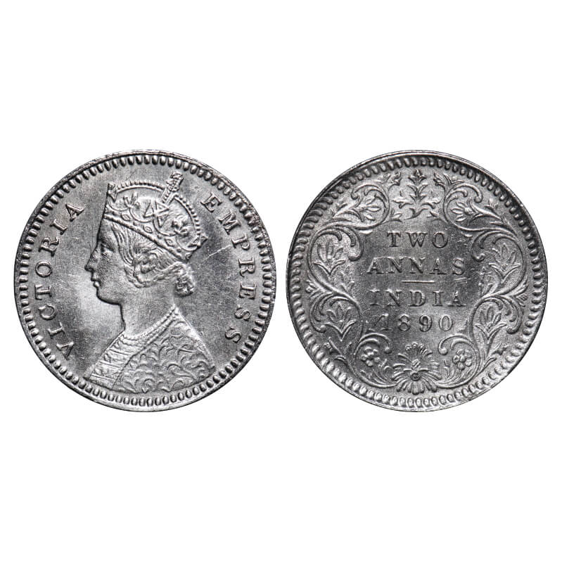 Victoria Empress, Silver, 2 Annas, 1890, Calcutta Mint, B/II, 'C' incused. F. Prid 505. GK 793. Almost Uncirculated. Rare.