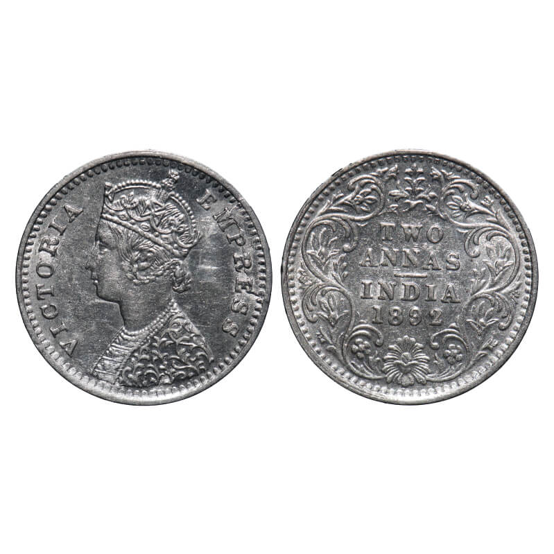 Victoria Empress, Silver, 2 Annas, 1892, Bombay Mint, B/II, 'B' incused. F. Prid 547. GK 796. Almost Uncirculated. Rare.