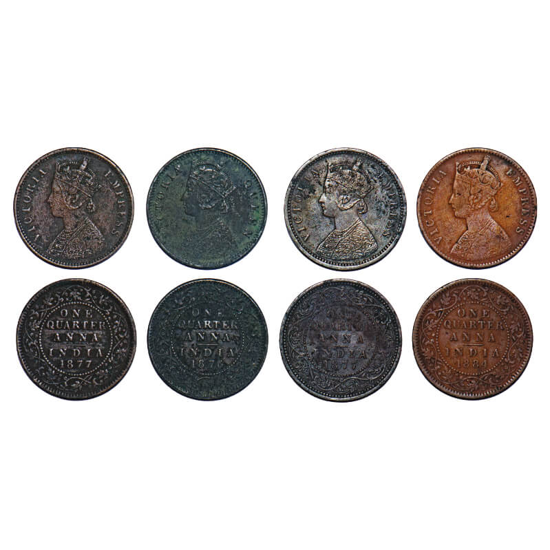 | Victoria Queen & Empress, Copper, Quarter Anna, (4 coins), 1) 1876, Calcutta mint, B/II, No mint mark, 2) 1877, Bombay Mint, B/I, No mint mark, 3) 1877, Calcutta mint, B/II, No mint mark, 4) 1884, Calcutta mInt, B/II, 'C' incused. F. Prid 610, 637, 611, 617. GK 827, 828, 829, 839. Fine+ to Very Fine. Scarce as a lot. |